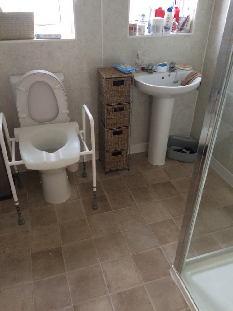 By removing the step up shower tray and screen, modifying the floor, extending the shower hose and installing a shower curtain, we were able to provide a safe showering experience, that the client was confident to use unaided and drained efficiently.