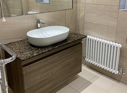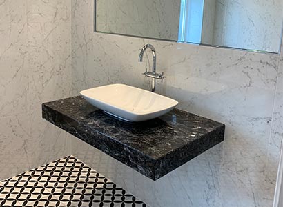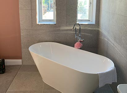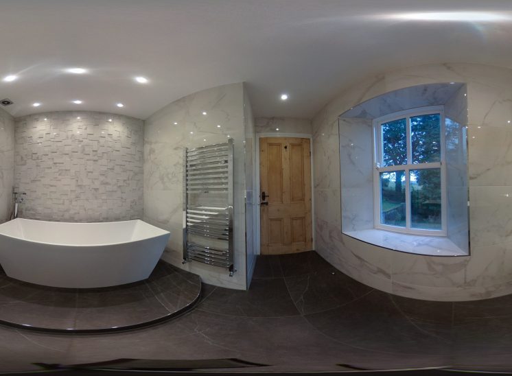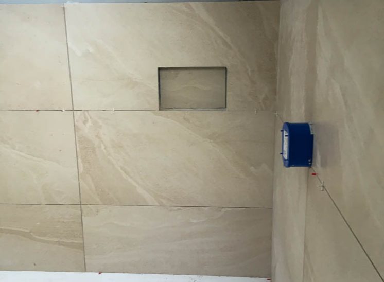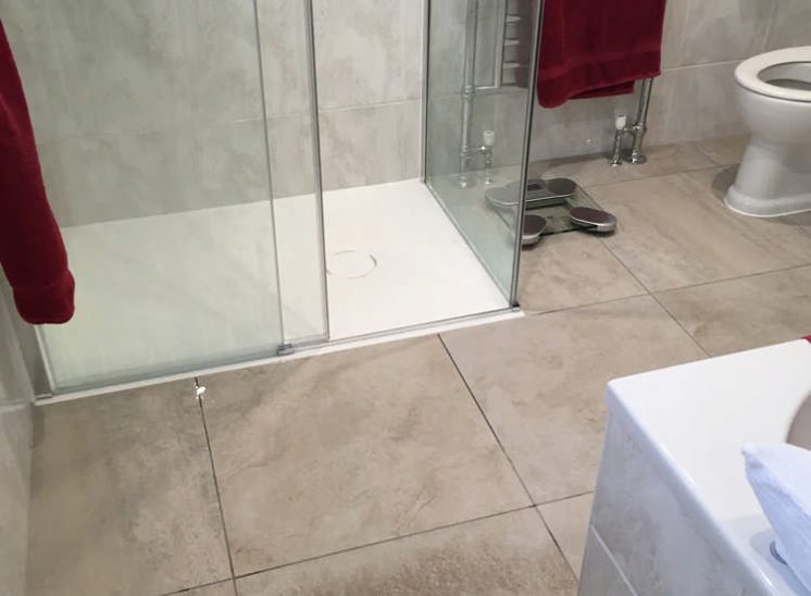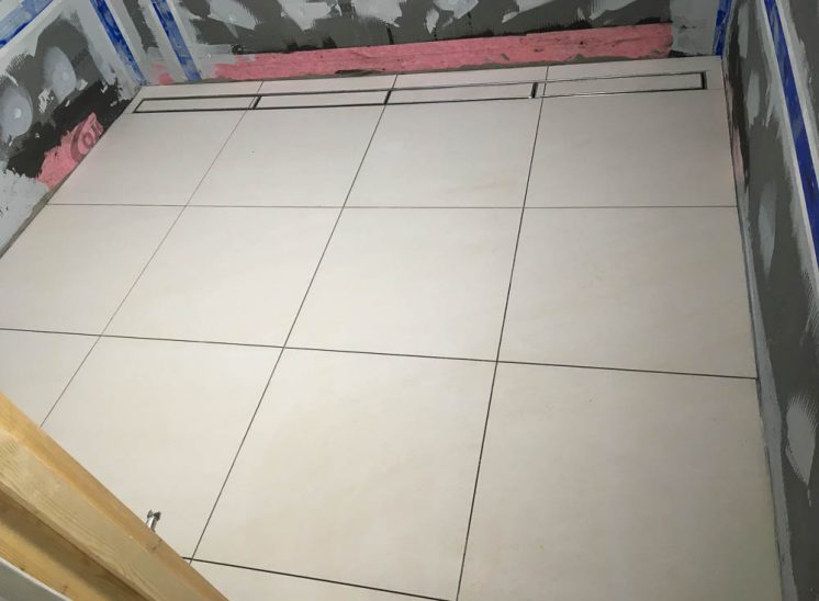 The floor tiles are 600 x 600 anti-slip floor tiles used and the wall tiling was a stone affect 1200 x 600.