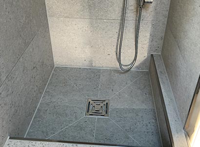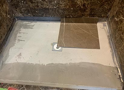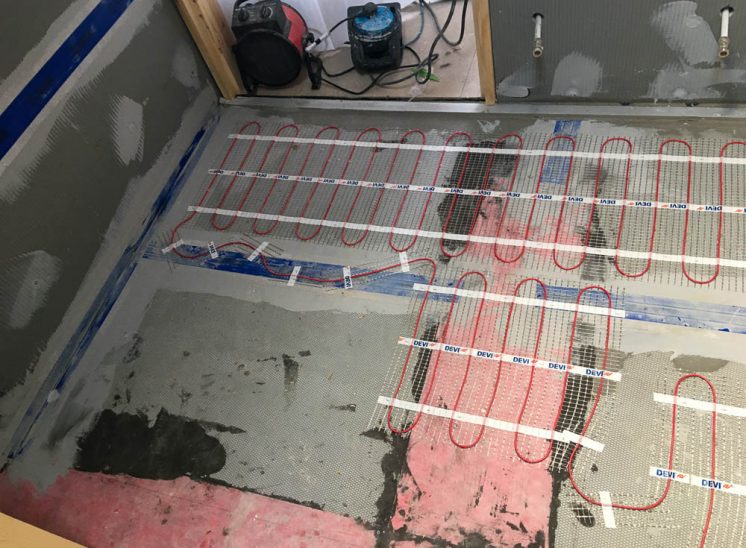 On the floor we used Marmox sloping boards to form the falls and then on top of this we installed the Devi heating cable to the area where the customer will walk .No heating cable was installed in the shower area section.