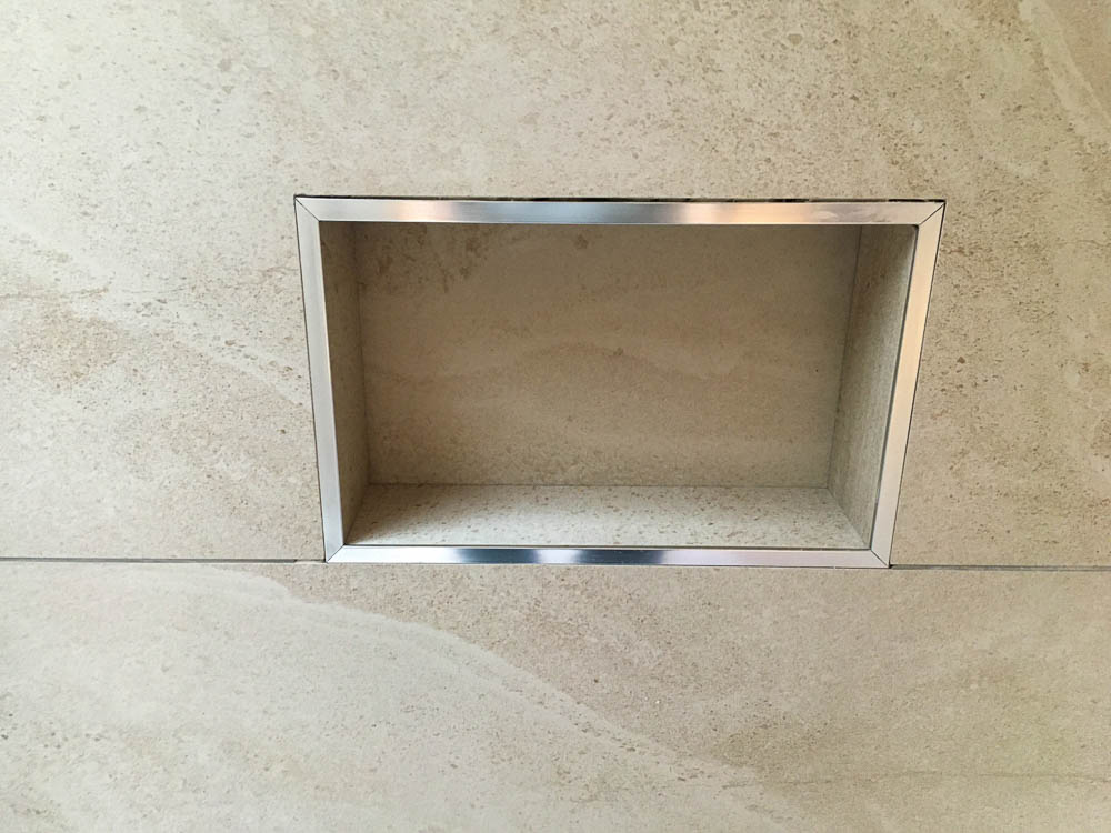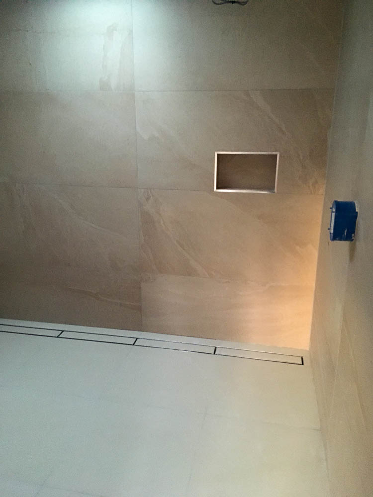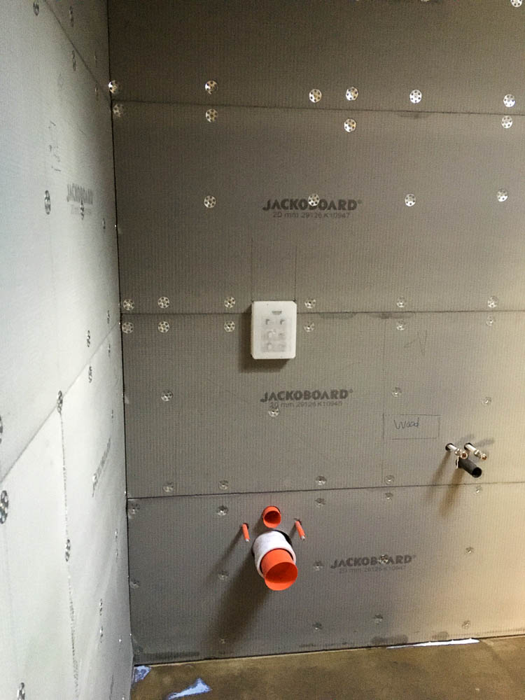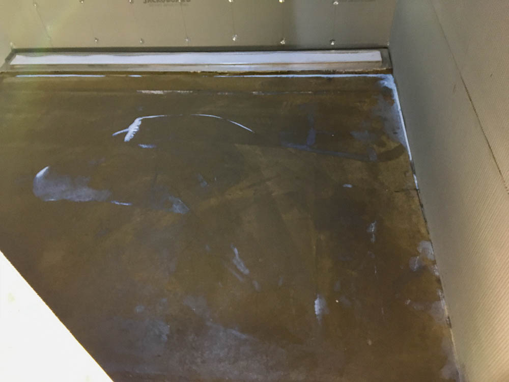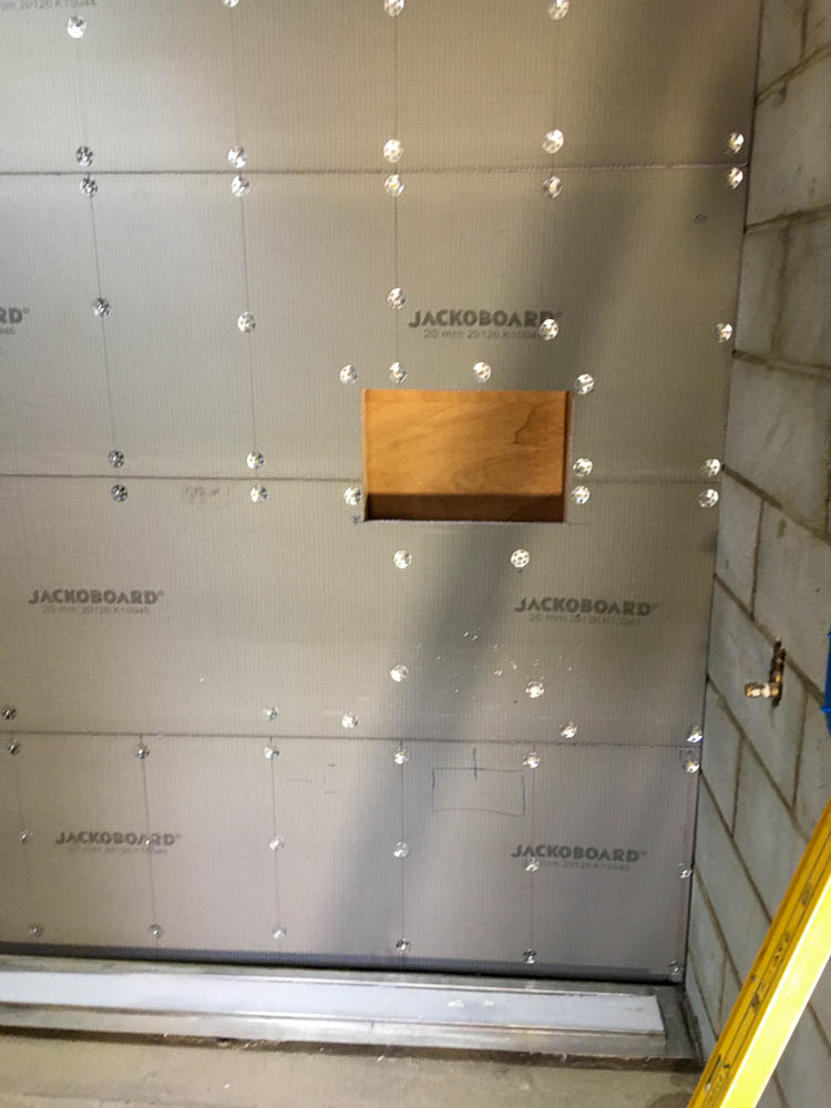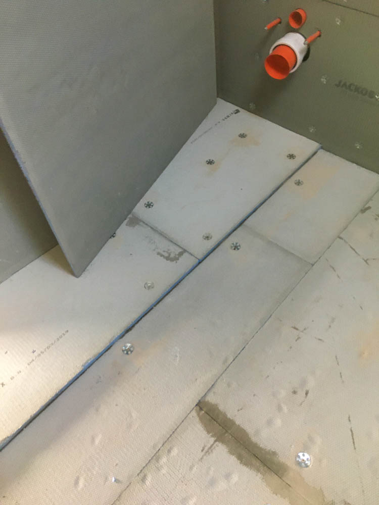 We carried out all of our preparation works to this room starting with the bespoke stainless steel channel which was made to fit the room with bespoke water trap built in. Then all of the room was boarded out with Marmox boarding on the walls and then taped for water proofing.