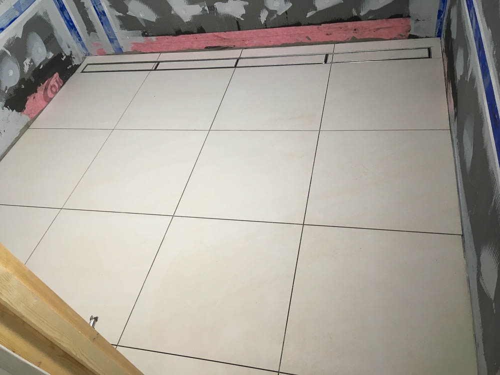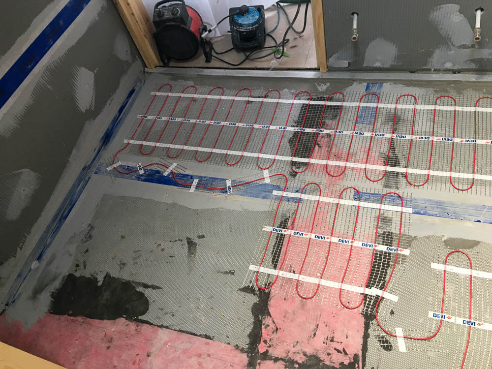 On the floor we used Marmox sloping boards to form the falls and then on top of this we installed the Devi heating cable to the area where the customer will walk .No heating cable was installed in the shower area section.