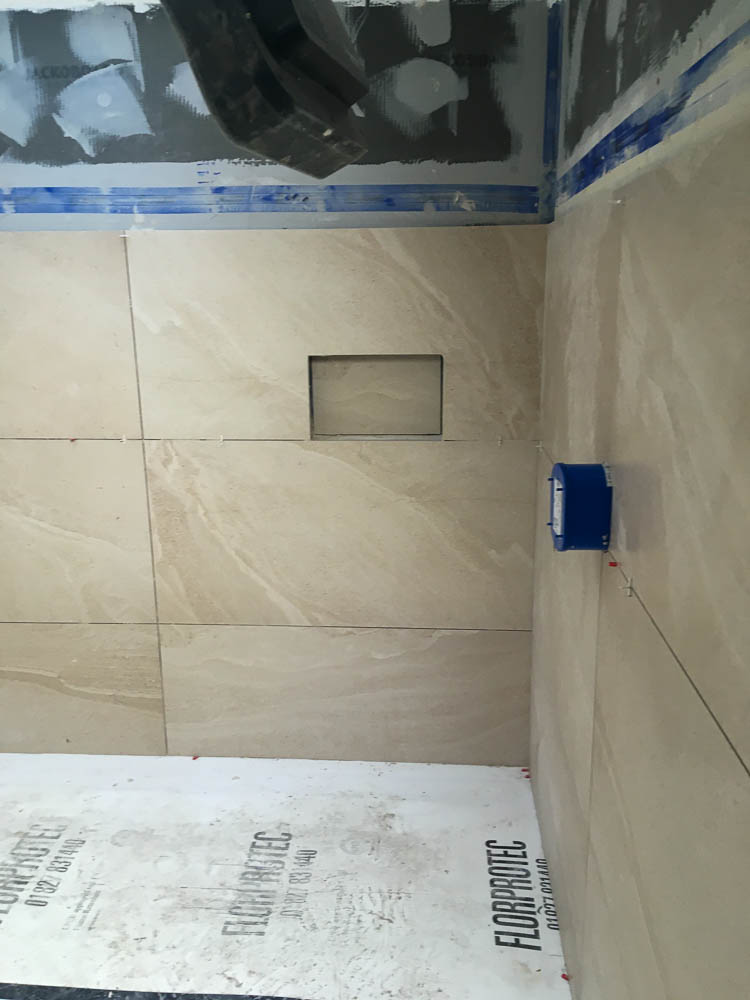 The floor tiles are 600 x 600 anti-slip floor tiles used and the wall tiling was a stone affect 1200 x 600.
