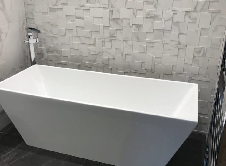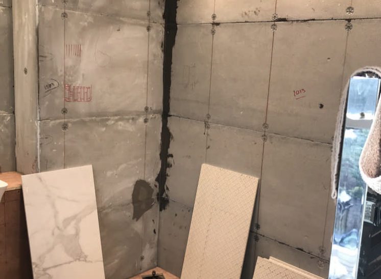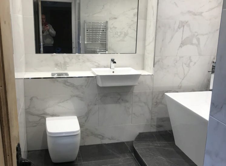This room required work to improve its drainage and a facelift to brighten it up. The bath was lifted up on to a bespoke plinth so that we were able to install the correct drainage falls within the floor and the walls were stripped and re-tiled in a porcelain carrara marble lookalike tile, to great effect.