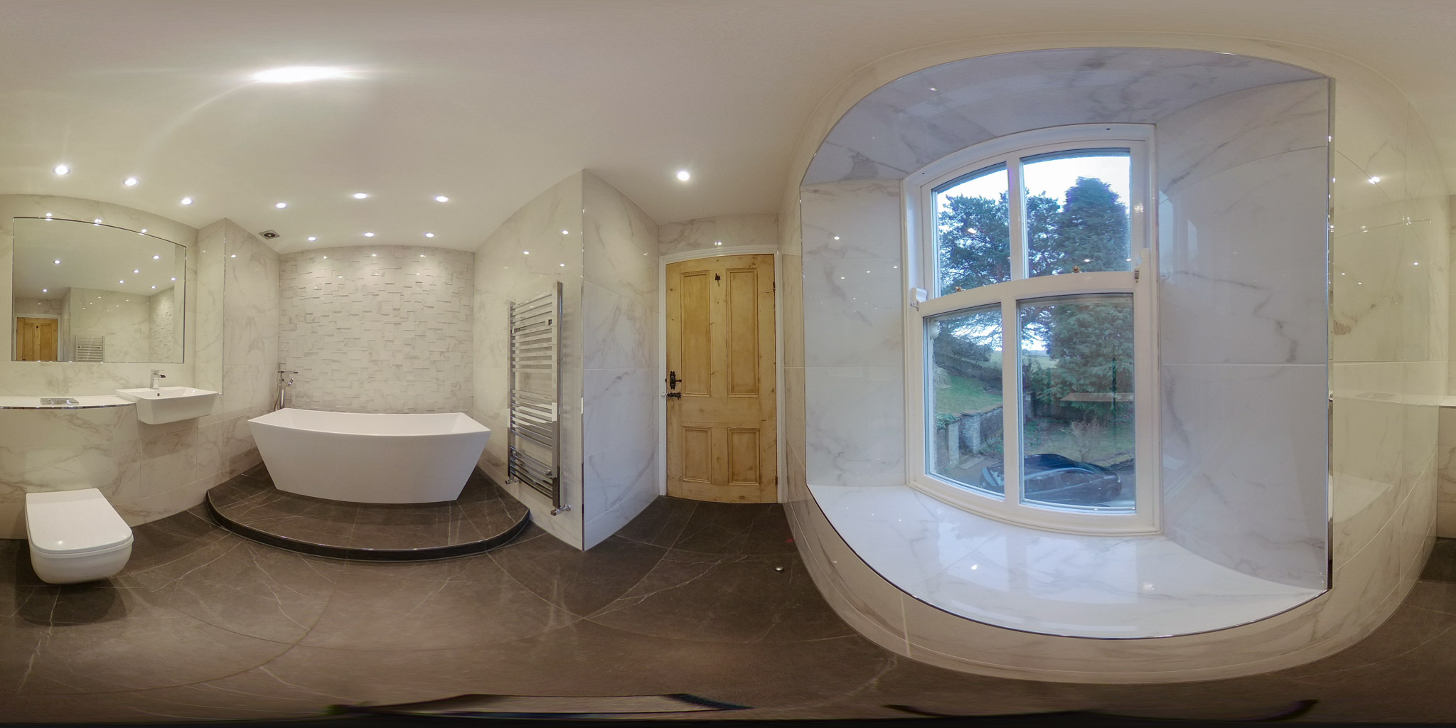 This room required work to improve its drainage and a facelift to brighten it up. The bath was lifted up on to a bespoke plinth so that we were able to install the correct drainage falls within the floor and the walls were stripped and re-tiled in a porcelain carrara marble lookalike tile, to great effect.